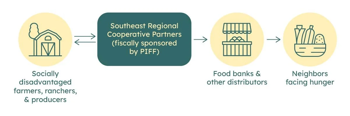 PIFF is the fiscal sponsor for the Southern Region LFPA program, working with Southeast Regional Cooperative partners to purchase and distribute food from socially disadvantaged farmers and ranchers. This region includes southeast and southwest regions.